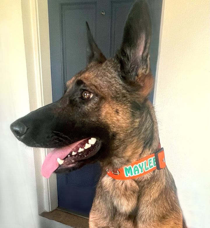 Better than embroidery.  This Team Colors Autograph Collar is one of a kind made from scratch just for your pet with their name dyed into the webbing, with a process that is not embroidered, but creates a unique custom made and custom tailored dog collar that will last for many years!  Phone number can be added with no extra charge.