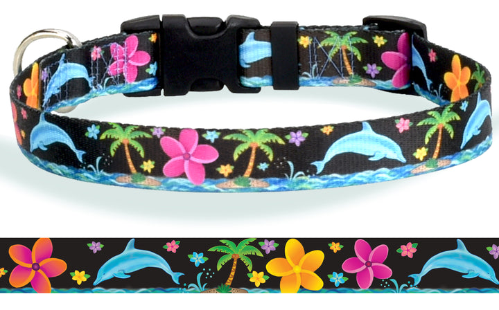 Dolphins and Frangipani Flowers Dog Collar on Black