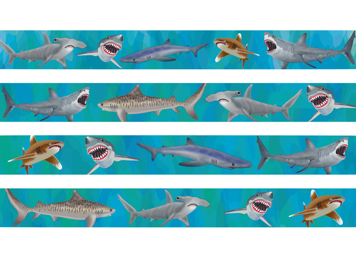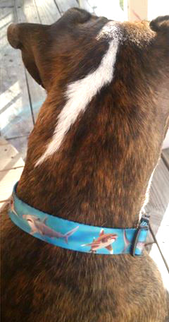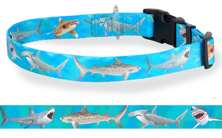 Great White, Bull Shark, Tiger Shark, Hammerhead, Oceanic White Tip on a Key West Dog Collar in Blue by Wagadoodle.