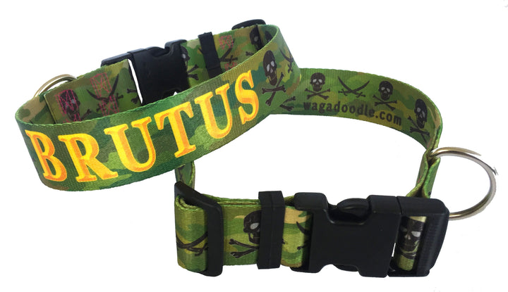 Pirate Skull and Crossbone dog collar design on a Army Green camo background