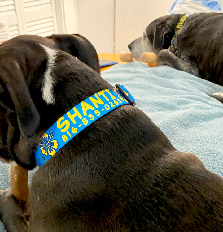 Handmade to Order.  All Collars can be Personalized.  Tailored Sized and Custom Dyed Webbing that makes a totally colorfast and bleachable collar that will last for years and years in the sun, the ocean, lake or pool.   Can be thrown right into washing machine.