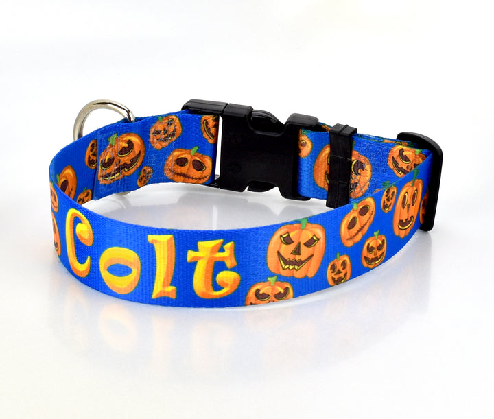Halloween Pumpkins on Blue Personalized Dog Collar