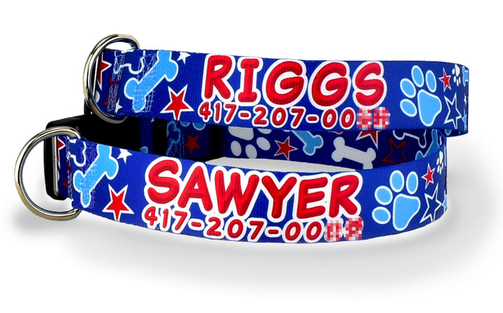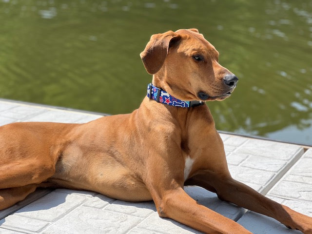 Our Patriotic Pup Dog Collar celebrates the 4th of July and American Independence with its eye-catching red, white, and blue design with Bones Stars & Paws.  Show off your pup's patriotic spirit with this festive 4th of July inspired dog collar.