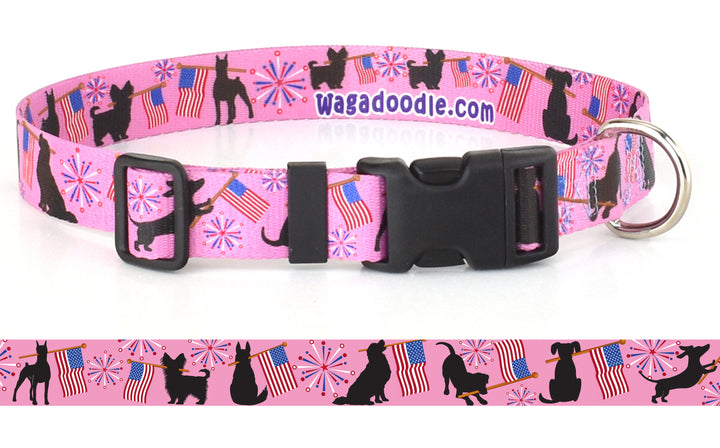 The 4th of July Parade of Paws Pink Dog Collar is a highly-recognizable USA-inspired piece. Celebrate after the parade with festive activities such as sparklers, burgers, hot dogs, Fireworks and of course beer, don't forget the beer!
