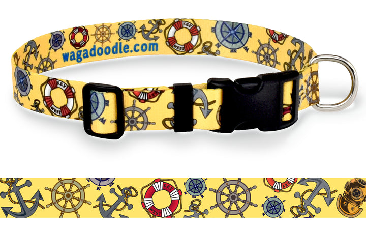 Yellow Mariner Dog Collar has a traditional nautical, coastal, working schooner, sailor theme.  Design includes Compass Rose, Brass Dive Helmet, Ships Wheel. and Anchor and a Life Buoy.