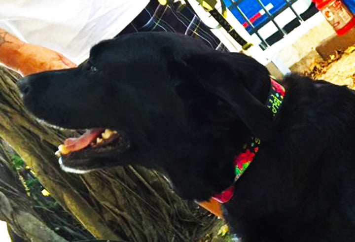 Tropical Hawaiian Plumeria Frangipani Aloha Dog Collar with a lush Black Background and exotic deep Red Flowers. Matching Leash and Pet ID Tags available.