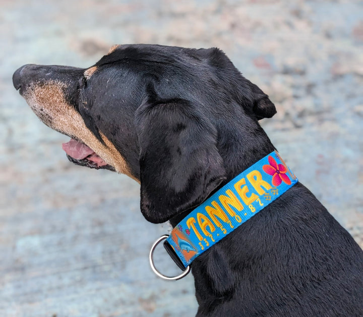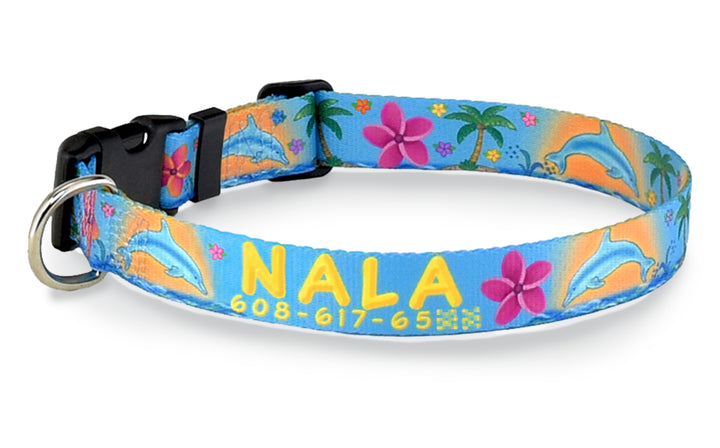 Dolphins and Frangipani Flowers Blue Personalized Dog Collar