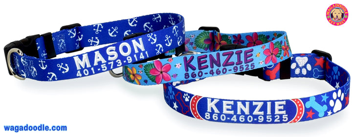 Handmade to Order.  All Collars can be Personalized.  Tailored Sized and Custom Dyed Webbing that makes a totally colorfast and bleachable collar that will last for years and years in the sun, the ocean, lake or pool.   Can be thrown right into washing machine.